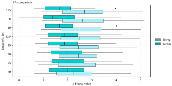 The y-axis in Figure 8 lists the different window sizes in meters, starting from 6.25 m and going up to 50 m. The box plots are colored light blue and turquoise and differ in the regression method used to estimate the fractal values. The turquoise box plots use the RANSAC regression method, while the light blue box plots use the conventional fractal analysis method (fitted linear regression). Figure 8 demonstrates that both the RANSAC and linear regression methods exhibit similar behavior across all window sizes examined, with the median of all window sizes falling between a difference in fractal values of −0.1 and −0.3.