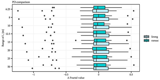 PO Comparison: Box plots of differences in fractal value (Δ fractal value) across various window sizes ranging from 6.25 to 50 m, calculated with linear regression (linreg) and RANSAC. Black dots indicate outliers, defined as values beyond