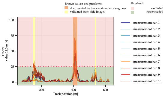 Exemplary track section with defined threshold value of 25 for fractal value with window size of 12.5 m. The individual measurement runs are displayed in different colors.