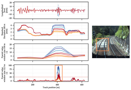 When analyzing the standard deviation shown in Figure 12, two significant anomalies appear along the track. However, when considering the fractal value, only one of these two positions is associated with issues originating from the ballast bed. The corresponding fractal value estimated with a sliding window of 150 m does not clearly indicate whether the ballast bed contamination extends over nearly 100 m or is confined to a smaller area. In this context, FRED demonstrates its advantage due to its reduced sliding window size. The position detected using FRED correlates with a localized weak point in the ballast bed. An image from the track recording car confirms a localized weak point in the ballast bed within the analyzed track section. While the fractal analysis with a 150 m window size can detect such weak points, it lacks precise localization capabilities and fails to reflect the severity of the issue. This is because the magnitude of the fractal value is mitigated by the track condition adjacent to the weak spot. In contrast, the fractal analysis with a window size of 12.5 m not only identifies problem areas but also locates them precisely.