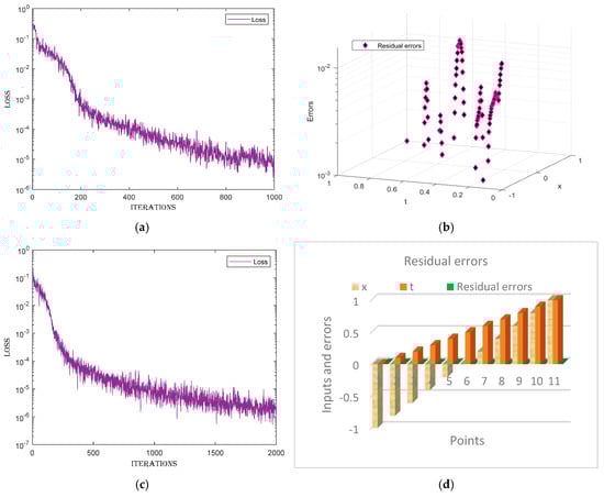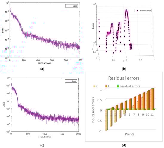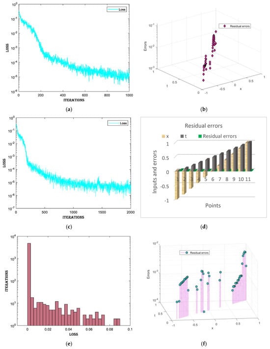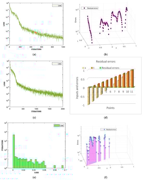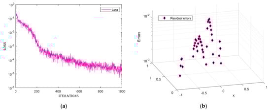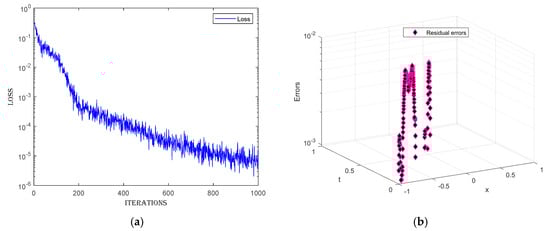 The graph of the loss values is shown in Figure 9a. Figure 9a shows the loss values for iterations of the -point distribution of the domains of and , where the value of the fractional order parameter is . The -axis of the graph represents the number of iterations, and the -axis represents the loss values. From Figure 9a, the loss value decreases and approaches zero as the number of iterations increases, which shows that we are approaching the optimal solutions. At the start of the iterations, the loss value is not close to zero, but at the iteration, the loss value is very close to zero. This means that as we approach the iteration, the solutions approach their best optimal values. Figure 9b shows the graph of the residual error values. Figure 4b shows the errors obtained during the iterations for the -point distributions of the domains of and . Figure 9b shows the and error values. All the error values range from to . Figure 4b shows that the errors are very close to , indicating the accuracy and consistency of our proposed technique.