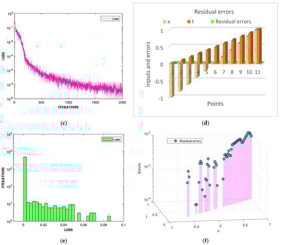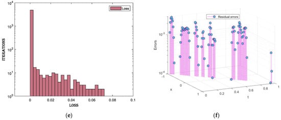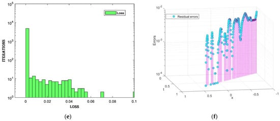 The graph shown in Figure 8e is for the loss values obtained after approximately iterations by taking different points between the domains of and . The value of the fractional parameter is . The iterations are represented through the -axis, while the loss values are shown on the -axis of Figure 8e. In approximately 0 iterations, the loss values overlap each other. The histogram in Figure 8e shows the consistency of our proposed technique. The residual error values are shown in Figure 8f. These are the errors obtained through different points between the domains of and . iterations are used to obtain these residual errors. The errors are very close to those of , clearly showing the validity and consistency of the proposed technique.