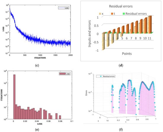 The loss value graph is shown in Figure 9c. The graph shown in Figure 9c is for the loss values obtained after approximately 2000 iterations by taking different points between the domains of and . The value of the fractional parameter is . The iterations are represented on the -axis, while the loss values are shown on the -axis of Figure 9c. As the number of iterations increases, the loss value decreases and approaches zero, indicating that we are approaching the optimal solutions. At the beginning of the graph, the loss values are not close to zero, whereas at the end, the values are close to zero. Additionally, at the start of the graph, the loss values vary, but after iterations, the graph becomes smooth, showing that the solutions obtained through the proposed technique approach optimal solutions. The error values are shown in Figure 9d. These errors are obtained through different points between the domains of and . iterations are performed to obtain these errors. We take different points from the points. Clearly, the errors are very close to 0, confirming the validity and consistency of the proposed technique.