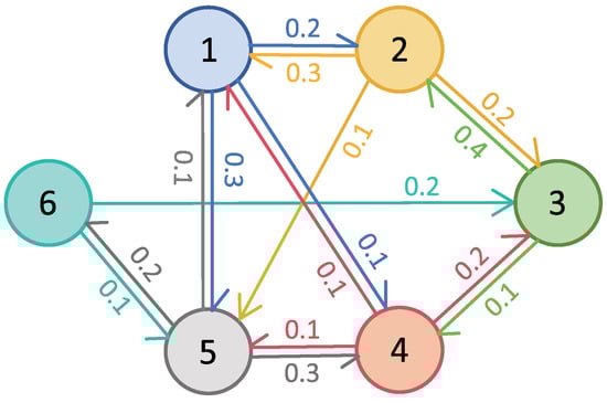 A positive vector can be found by utilizing the MATLAB R2024a NULL function, which satisfies . According to the definition of , one can calculate . Set the parameter of controller . The initial value is chosen as random constants within the range for with . The directed topology of network (23) is shown in Figure 1.