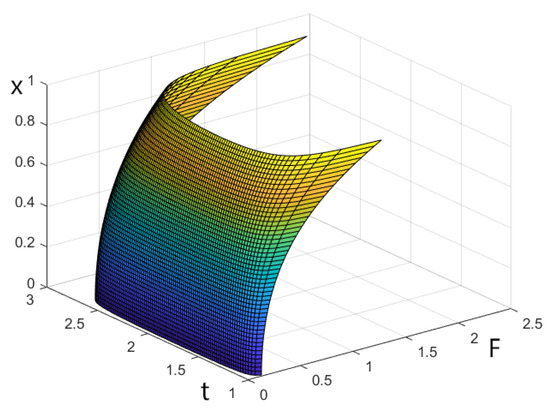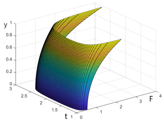 Figure 1 and Figure 2 show a visualization of singular nonlinear terms of ; note that is similar with , hence we omit the impact of here. It is found that the nonlinearity is singular at and e. Although the nonlinear term has significant singularity, it can be controlled by an integrable function, so the solutions of the equation are still stable and robust. By a simple calculation, we have