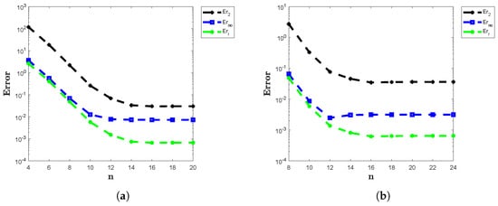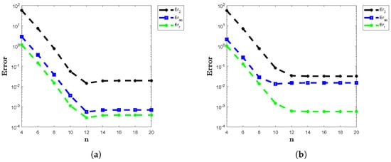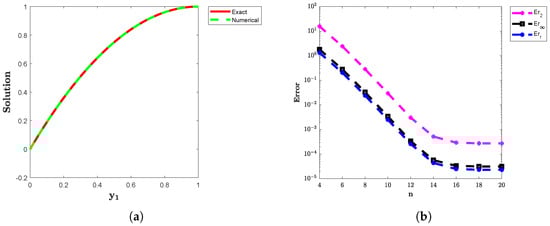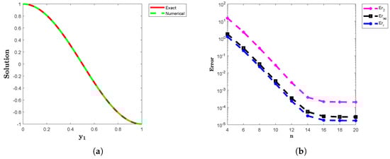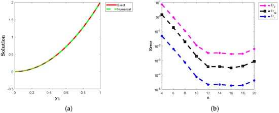 The analytical solution for Example 2 is given by Table 2 summarizes the error values , and for various parameters n, , and . Additionally, Table 2 shows that varying the quadrature nodes (n) and spatial nodes in both local and global domains consistently yields accurate and stable results. In Figure 2a, the approximate solution is plotted alongside the exact solution, offering a visual comparison, while Figure 2b provides a detailed look at the error measures , and , which vary with increasing n. The results demonstrate a clear reduction in error as n grows, highlighting the improved accuracy of the method with higher n values.