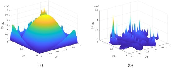 (a) of the proposed numerical method applied to Example 4 on a square domain with , and . (b) of the proposed numerical method applied to Example 4 on a star-shaped domain with , and .