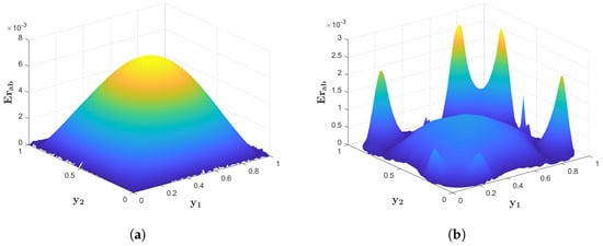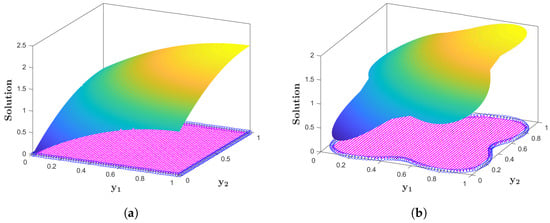 (a) of the proposed numerical method applied to Example 5 on a square domain with , and . (b) of the proposed numerical method applied to Example 5 on a nut-shaped domain with , and .