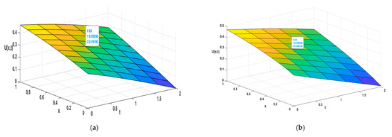 Table 5 shows the effect of generalized Caputo fractional derivatives , with the suggested techniques for the results obtained at = 1, 0.9, , 0 ≤ t ≤ 1 and x = 0.55. The very good agreement among the obtained solutions with the exact ones [35] verifies the capability of these techniques to deal with the modified BBM problem. Also, the numerical solution U increases with increasing time and decreases with .
