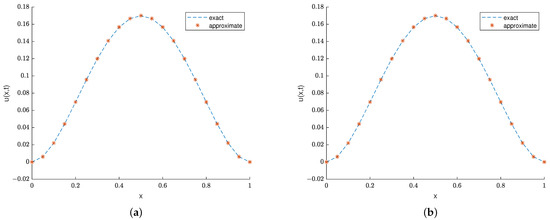 (a) The numerical solution and exact solution of Example 1 under . (b) The numerical solution and exact solution of Example 1 under .