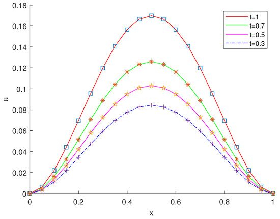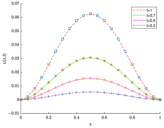 The second and third columns of Table 1 show the error between the numerical solution and the exact solution of Example 1 at and . The fourth and fifth columns of Table 1 show the errors between the numerical solution and the exact solution of Example 1 at and , respectively. Table 2 shows the max errors and convergence orders between the exact solution and the numerical solution of Example 1 and compares the obtained results at with those in [24,42]. Figure 1a,b, respectively, display the numerical solution and exact solution of Example 1 at . Figure 2 shows the numerical and exact solutions of Example 1 at different times. Figure 3 shows the numerical solution of Example 1 at different . From these results, we can conclude the effectiveness of our method.