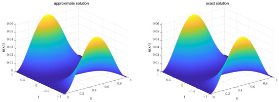 Table 3 shows the errors and convergence orders of Example 2 with , respectively. Table 4 shows the errors of Example 2 with , respectively. Figure 4 displays the numerical solution and exact solution of Example 2 at . Figure 5 shows the errors between the numerical solution and the exact solution of Example 2 at and , respectively. Figure 6 shows the 3D surface plots of the approximate and exact solutions for Example 2.