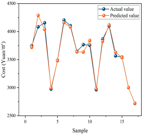 According to the results in Table 1 and Figure 1, the results obtained by the method based on the principle of similar information priority are very close to the actual values, and the fitting and predicted MAPE values are very small, 1.32% and 0.13%, respectively. The results show that this method can improve the effect and performance of prediction. Projects with similar related factors tend to produce similar project costs, and projects with high similarity are ranked at the forefront. Such a ranking method can give full play to the information of similar projects in a targeted way and help improve the prediction accuracy. Therefore, in this paper, we adopt the principle of similar information priority and deeply consider the fact that projects with similar factors often generate similar costs. This helps to obtain higher precision and accuracy of the prediction results.