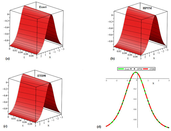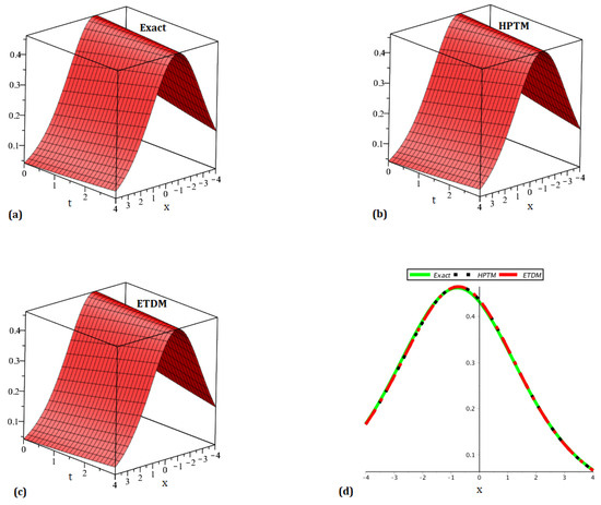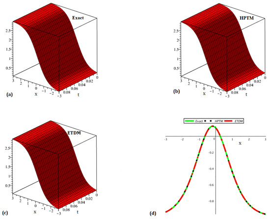 Plot (a) representing the precise solution, (b) HPTM solution, (c) ETDM solution, and (d) representing the comparison of the precise and proposed schemes solution for .