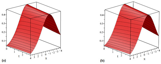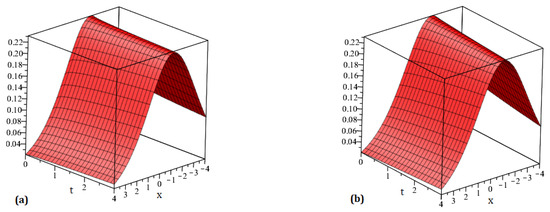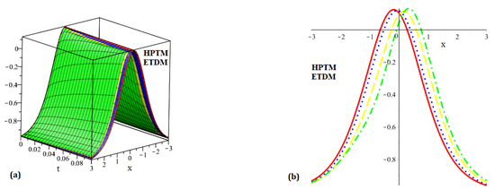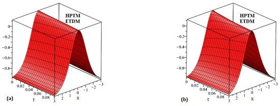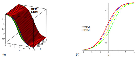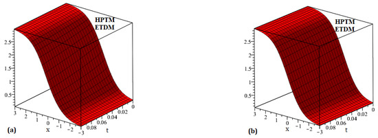 Four diagrams are shown in Figure 7: (a) the precise solution of , (b) representing the HPTM solution of , (c) representing the ETDM solution of , and (d) representing the 2D comparison of the precise and proposed schemes solution for . Figure 8 is split into two sections: the solutions for the suggested strategies are (a) at and (b) at . Similarly, Figure 9 presents two diagrams: (a) the 3D surface solution of the suggested methods and (b) the 2D surface solution of the suggested methods of . In a similar way, four diagrams are shown in Figure 10: (a) the precise solution of , (b) representing the HPTM solution of , (c) representing the ETDM solution of , and (d) representing the 2D comparison of the precise and proposed schemes solution for . Figure 11 is split into two sections: the solutions for the suggested strategies are (a) at and (b) at . Similarly, Figure 12 presents two diagrams: (a) the 3D surface solution of the suggested methods and (b) the 2D surface solution of the suggested methods of . The precise results and approximate results achieved by the proposed strategies for and are compared in Table 5 and Table 6. The convergence of fractional-order solutions towards integer-order solutions has been confirmed by the graphical and tabular representations. We just compute the iteration up to three terms, and our solution series swiftly converges to the exact result. To increase the approximate outcomes accuracy, a few additional iterations can be examined. The similarity of the results obtained validates the accuracy of the suggested strategies.