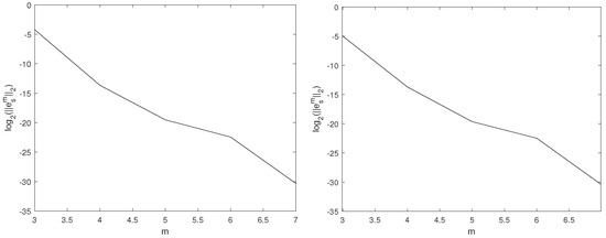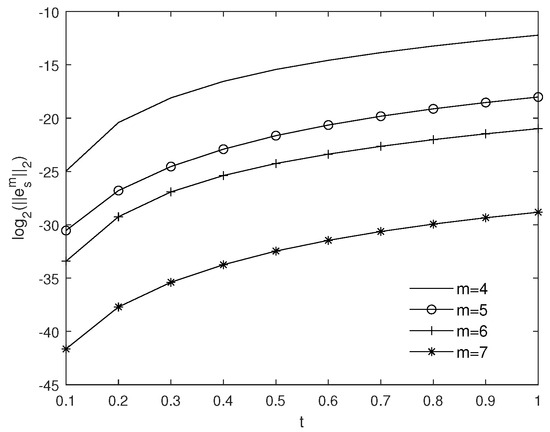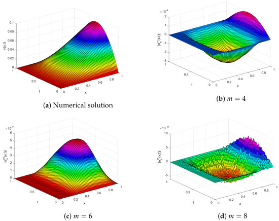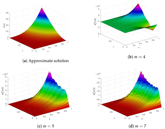 Table 1 reports the absolute errors calculated for various x and t values. Figure 1 demonstrates how parameter m affects the error and verifies the convergence analysis. Upon observation, as m increases, the error declines rapidly. In Figure 2, we demonstrate the error at various values of t by choosing various m, when is equal to . Figure 3 illustrates the plotted values for both the numerical solution and their associated absolute errors.