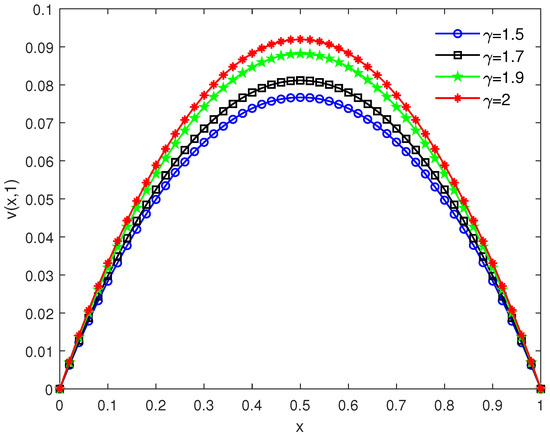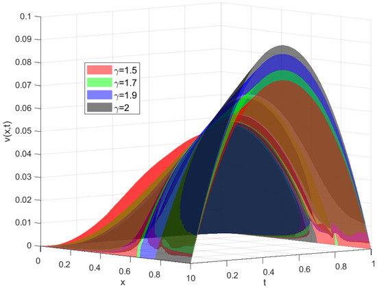 Numerical solutions for different selections of , taking , , and (Example 2).