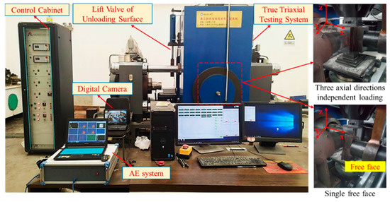 While there are relatively few studies on the true triaxial test [39,40,41], Li et al. [42] used a self-developed rock explosion experiment to explore the characteristics of the rock explosion energy evolution and the mechanism of rock explosion energy excess. Liu et al. [43,44] investigated the effect of different unloading rates on the strain energy density of rock and found that it is of great significance to the prediction of the stability of the rock. Liu et al. [45] used the true triaxial disturbance unloading rock system, an acoustic emission system, and a micro-camera to study the unloading damage law under different intermediate principal stresses (σ2), which helped to understand the control mechanism of the excavation of surrounding rock. Xu et al. [46] conducted loading and unloading tests of sandstone with different principal stress directions, analyzed the mechanical properties and damage characteristics of high-stress rock bodies under different principal stress loading and unloading conditions by true triaxial tests, and investigated the secondary anisotropy and energy evolution mechanism of different principal stress loading and unloading rock bodies. Liu et al. [47] analyzed the variation in stress–strain curves and the influence of three-dimensional principal stress loading and unloading on rock mass using the true triaxial loading and unloading test and the true triaxial compression test. Based on the true triaxial loading and unloading stress–strain evolution law and loading and unloading characteristics, Zhao et al. [48] calculated the elastic energy density, dissipated energy density, and input energy density of true triaxial cyclic loading and unloading by using the graphical area integration method and the superposition method, respectively. The effects of true triaxial stress cyclic loading and unloading on the energy accumulation and dissipation of sandstone were obtained, and the true triaxial simultaneous loading and unloading test verified the rationality and accuracy of the energy analysis method.