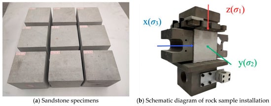 Firstly, according to the requirements of ISRM, the parent rock, which is intact and has no obvious fissures in appearance, was selected to reduce the error caused by the discrete type of specimen. Secondly, the cubes were processed into 100 mm × 100 mm × 100 mm cubes in the laboratory, so that their surfaces were smooth and each group of opposite sides were parallel to each other, with an error of ±0.05 mm in end face flatness and ±0.25° in perpendicularity. Complete sandstone specimens were obtained as a result, as shown in Figure 2a. Finally, an MC-6310 non-metallic ultrasonic detector was used to test the wave speed, and the sandstone samples with obvious deviation in quality and size and wave speed deviation range higher than 10% were excluded, and the wave speed of the selected samples ranged from 2.4 to 2.6 km/s. In addition, during the installation of the fixture of the specimens before the test, the rock samples were always Z-direction-loaded, always along the direction perpendicular to the rock stratification, as shown in Figure 2b.