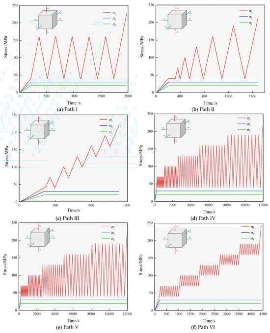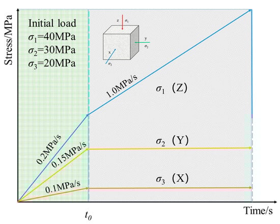 Simultaneous loading in the x, y, and z directions to 20, 30, and 40 MPa was conducted at rates of 0.1, 0.15, and 0.2 MPa/s, respectively. This load level was designated as the preset load for descriptive purposes. Following the application of x, y, and z to the predetermined load, the rock was subjected to loading in the z-direction at a rate of 1.0 MPa/s until failure occurred. The loading trajectories are illustrated in Figure 3.