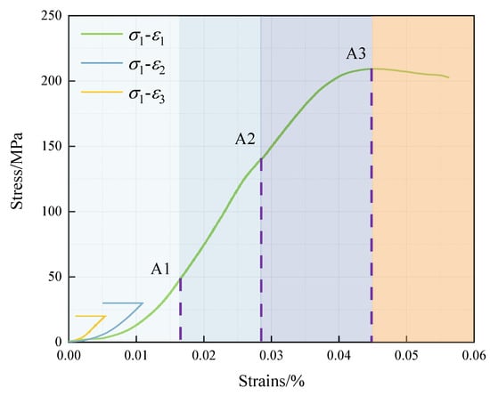 Figure 5 shows that the sandstone displays distinct compressive, elastic, and plastic phases throughout the triaxial loading process. To aid in the study, the three primary stress orientations of sandstone are characterized by positive compression, meaning that compression induces a positive strain. The stress–strain curves in the σ1 direction exhibit convexity towards the strain axis when the sandstone is subjected to the predetermined load, signifying that the three predominant stress orientations mostly compress the natural pores in the sandstone throughout the concurrent loading process. A1 represents the critical strain during the compaction and elasticity stages; upon reaching the designated load and further increasing σ1, the sandstone stress–strain curves exhibit an approximately linear progression, characterizing the elasticity stage of the rock. A2 denotes the critical strain between the elastic and plastic stages; as σ1 continues to rise, the sandstone stress–strain curve transitions from the elastic stage to a nonlinear evolution, indicating the onset of the plastic stage. A3 signifies the critical strain between the plastic and failure stages; following the increase in σ1 after the designated load is attained, the strains in the σ1 and σ3 directions progressively diminish.