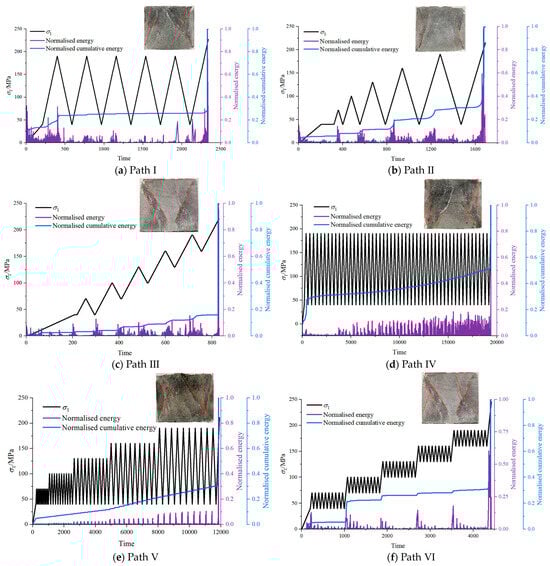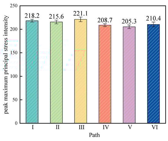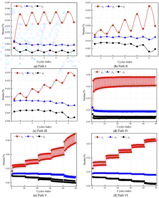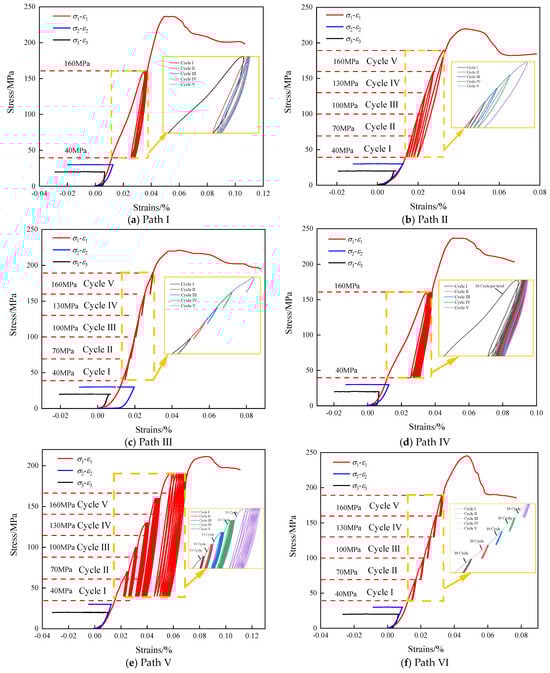 As shown in Figure 7, when the σ1 direction stress increases, stresses in the other two directions remain unchanged, but the strain tends to decline. When the stress in the σ1 direction falls, the strain in the other two directions tends to increase. Under other loading paths, cyclic σ1 has a similar behavior, i.e., variation in one principal stress will not only cause a change in strain in that direction but also cause a change in strain in the other two directions. Based on the analysis of the σ1 cyclic loading and unloading data, it is revealed that the strains generated by σ2 and σ3 can be classified into elastic and residual strains during σ1 cyclic loading and unloading. This also shows true triaxial cyclic loading and unloading stress–strain curves under different paths. As indicated, variation in the cyclic loading and unloading path does not change the evolution trend of stress–strain, and the unloading curve is always lower than the loading curve. The outer envelope of each unloading point of σ1 has an obvious compaction stage, elastic stage, weakening stage, and post-peak failure stage. Indeed, hysteresis loops were observed in the stress–strain curves of sandstone specimens exposed to cyclic loading and unloading under all paths, especially under Paths 2 and 5. When failure occurred, peak maximum principal stress intensities under Paths 2 and 5 were 219.8 and 211.3 MPa, respectively, and were lower than those in other paths. This can be attributed to the fact that the lower limit of staged cyclic loading and unloading amplitude is the largest, and the damage accumulated under the same conditions of stages and cycles is more serious, resulting in obvious fatigue damage to the rock samples.