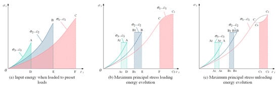Compared with uniaxial compression, true triaxial energy evolution is relatively complicated because the change in principal stress in one direction affects the principal strain in the other two directions, illustrated by the energy schematic diagrams and formulas to facilitate the analysis, as shown in Figure 9. The energy analysis reveals that the damage generated by the rock body has little effect on the elastic energy density of rock storage [20]. The use of traditional elastoplastic mechanics is often not an accurate description. According to thermodynamics, the stress–strain curve of a material cannot reflect the essential characteristics of material damage; energy transformation is the crucial characteristic of the physical process of the material; and rock damage is an energy-driven instability phenomenon. The energy accumulation and dissipation in the true triaxial compression process is accompanied by the method of rock deformation and destruction. To analyze the energy evolution law under the true triaxial compression of rock more clearly, the energy density in the process of rock deformation and destruction can be calculated using the area integral, so in this paper, the energy density in the process of loading and unloading in the true triaxial cyclic loading and unloading of sandstone is calculated using the area integral method.