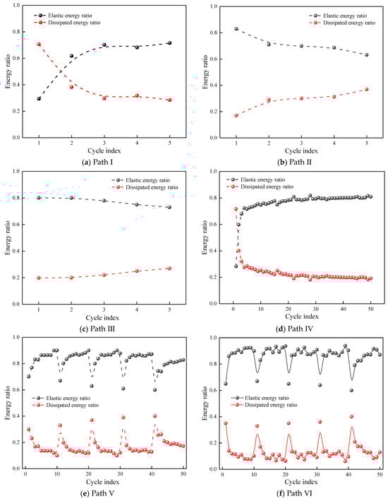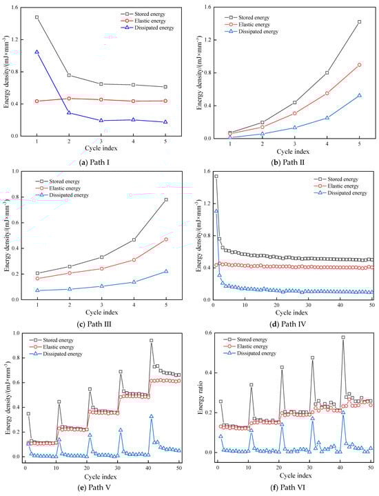 Figure 11 shows the evolution curve of true triaxial cyclic loading and unloading paths for different energy density ratios related to input energy density. As shown in Figure 11a,d, the elastic energy density of the first loading and unloading storage under Paths 1 and 4 is relatively low, and the ratio of elastic energy density to input energy density increases and stabilizes with the increase in loading and unloading cycles. Similarly, with the increase in loading and unloading cycles, the dissipated energy density of the rocks decreases and stabilizes. According to Figure 11b,c, the percentage of elastic energy density decreases slowly with the increase in stages. In contrast, the percentage of dissipated energy density is opposite to that of elastic energy density under Paths 2 and 3. According to Figure 11e,f, the elastic energy density percentage curves during cyclic loading and unloading in each stage show a significant drop in the first cycle. Then, the percentage of elastic energy density tends to stabilize with the increase in cycles under Paths 5 and 6, which is similar to the energy distribution pattern of Paths 1 and 4. With the increased number of stages, the evolution trends of the elastic and dissipated energy shares at each upgrade point (after 1, 11, 21, 31, and 41 cycles) under Paths 5 and 6 are consistent with those of Paths 2 and 3.