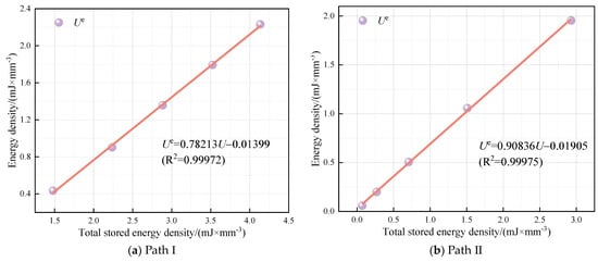 Energy studies have shown that the effect of cycles on the elastic energy of uniaxial compression is small [17,22], and it can be assumed that the true triaxial staged cyclic loading and unloading follows the same pattern based on the experimental results. After the initial cyclic loading and unloading, the elastic energy density evolution of Paths I and IV does not change with the number of loading and unloading cycles, and their evolution curves follow a specific curve, indicating that the elastic energy density evolution within the rock is only related to the stress level during the equal-amplitude cyclic loading and unloading. The input and dissipation energies decrease slowly with the number of loading and unloading cycles. The number of cyclic loading and unloading cycles in Path IV is much higher than that in Path I, and the elastic energy density evolution is the same in both paths, but the input and dissipation energy densities decrease more in Path IV compared with Path I.