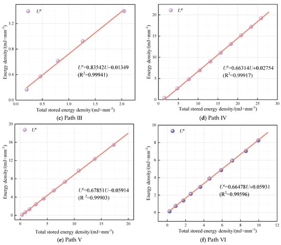 Figure 10 shows the energy density vs. the σ1 loading and unloading evolution curve of the true triaxial cyclic loading and unloading test. As shown in Figure 10a,d, from the first loading and unloading to the second loading and unloading under Paths 1 and 4, the input and dissipated energy density fall more, and the elastic energy density increases slightly. With the increase in cycles, the input energy density and dissipated energy density of the rock gradually reduce and stabilize, indicating that with the growing number of cycles, the releasable energy increases, which is characterized by the gradual hardening of the rock, and the cyclic σ1 has a reinforcing effect on the rock specimens. The elastic energy density fluctuates with cycles, but the magnitude is small. The number of cyclic loading and unloading cycles in Path IV is much higher than that in Path I, and the elastic energy density evolution is the same in both paths, but the input and dissipation energy densities show a greater reduction in Path IV compared with Path I. As shown in Figure 10b,c, input energy density, elastic energy density, and dissipated energy density increase with increasing stages under Paths 2 and 3; input (stored) energy density increases the fastest, elastic energy density increases the second fastest, and dissipated energy density increases the slowest, and all three have obvious nonlinear growth characteristics. According to Figure 10e,f, under Paths 5 and 6, the dissipated energy density and input energy density of the rocks in each cyclic loading and unloading level tend to experience a decline and change in an “L” shape with the increase in loading and unloading cycles, which is consistent with the energy evolution pattern under Paths 1 and 4, indicating that the dissipated energy density decreases as the rock is compressed with the increase in cycles in the same level, and the energy is mainly used for the closure of cracks in the rock. With the rising number of stages, the input (stored), elastic, and dissipated energy densities of each upgrade point (after 1, 11, 21, 31, and 41 cycles) increase with the number of stages under Paths 5 and 6, showing a nonlinearly increasing pattern.