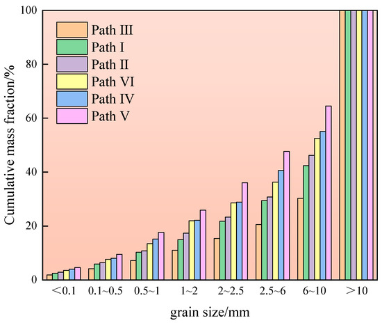 To study the fractal characteristics and energy evolution of sandstones under true three-dimensional stress states, a true triaxial compression test and a cyclic loading and unloading test of sandstone specimens under different loads were carried out using a self-developed true triaxial disturbance testing system. Based on the evolution law of true triaxial cyclic loading and unloading stress–strain, the types of loading and unloading in the cyclic loading and unloading test were delineated, and the reasons for the change in peak maximum principal stress intensity under different paths were analyzed. By analyzing the crushing characteristics of rock samples under different paths, it was found that the staged cyclic loading and unloading caused the greatest damage to the rock mass, while the equal-amplitude and unequal-lower-limit staged loading and unloading caused the least damage to the rock mass. Based on fractal theory, it was found that the rock samples under path V had the highest fractal dimension D. The elastic energy density, dissipated energy density, and input energy density of true triaxial cyclic loading and unloading under different paths were calculated by graphical area integration and superposition methods, respectively, to analyze the evolution of the three with the increase in the loading and unloading cycles and the energy distribution during the loading and unloading process. True triaxial cyclic loading and unloading tests revealed a linear relationship between the elastic energy density and total input energy density of the rock mass, and the energy storage coefficient exceeded 0.5, regardless of the loading path.