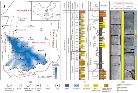 (a) Geological map of the Ordos Basin showing the thickness of the source rocks within the Chang-7 Member and the positions of the sampling wells. (b) Stratigraphic column illustrating the Upper Triassic Yanchang Formation. (c) Photos of rock texture displaying the siltstone layer and the clay shale interbedded with silty laminae. The figure is adapted from work by Wang et al. [].
