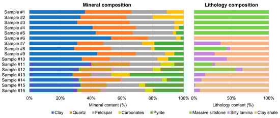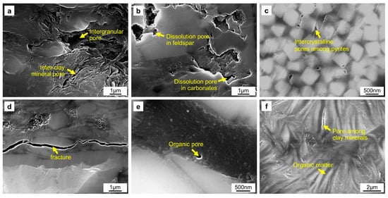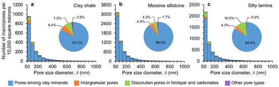 X-ray diffraction analysis was conducted on approximately 1 g of each ground sample using a Rigaku D/max-2500PC X-ray diffractometer (Tokyo, Japan), followed by computer diffractogram analysis to identify and semi-quantitatively assess the relative abundances (wt%) of different mineral phases. Mercury intrusion capillary pressure measurements were performed with a Micromeritics PoreMaster GT60 (Orlando, FL. Initially, a blank correction was applied for enhanced accuracy. Subsequently, approximately 0.5 g of each sample was weighed, loaded into the apparatus, and degassed under a vacuum of 50 μm Hg for 30 min. The mercury intrusion process monitored the infused mercury volume into the sample across a pressure range from 1 psi to 60,000 psi. Pore volume (cm3/g) and pore size distribution data were derived using the Washburn equation [], with detailed experimental procedures outlined in Yu et al. []. Quantitative analysis of different types of macropores across various lithologies was performed on a FEI Quanta 650 FEG field emission scanning electron microscope. High-resolution imaging was conducted at magnifications of 15,000 times (view field size = 17 μm × 20 μm), targeting stochastic regions set by random coordinates within the predefined areas for analysis across sample surfaces. Areas analyzed within each lithological sample exceeded 10,000 μm2, with image resolution surpassing 0.1032 pixels/nm. Diverse types of macropores within these images were quantitatively extracted using Fiji-ImageJ 2.1.0 software [], employing minimum Feret diameter as the metric for assessing pore size diameters. For a comprehensive understanding of the processes involved, a study by Wang et al. [] provides an extensive description of these experimental procedures.
