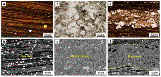 We collected sixteen core samples from the Upper Triassic Chang-7 Member of the Ordos Basin, with the locations of three sampling wells depicted in Figure 1a. The specific depths of the samples are detailed in Table S1 of the Supplementary Material. These samples, which are block-shaped with sides ranging from approximately 2 cm to 4 cm, encompass one or several lithological types, including clay shale, massive siltstone, and silty lamina. To accurately assess the lithological composition of each sample, we sectioned the cores into rectangular blocks and quantified the area proportion of the various lithologies within the profile perpendicular to the bedding planes. We then split each block along the profile, with each half (weighing over 20 g) earmarked for distinct analytical procedures. For the first set of samples, we prepared them by crushing, sieving, and using the fraction that passed through a 100-mesh screen for X-ray diffraction (XRD) analysis while selecting particles in the 20 to 35 mesh range for MICP measurement. Prior to MICP testing, we subjected the samples to a ten-day Soxhlet extraction with dichloromethane to remove pore-occluding bitumen. Following the extraction, we dried the samples at 80 °C for a minimum of 72 h until a constant weight was achieved. This temperature was chosen because it does not exceed the maximum temperatures that any of the collected samples experienced throughout their geological history (approximately 90 °C to 140 °C) [,], thereby preventing potential alterations to organic matter at higher temperatures. In this study, we opted for particulate rather than bulk samples for MICP analysis because particulate samples can be more thoroughly cleared of pore-occluding oil and attain higher levels of mercury intrusion saturation [,]. This makes them particularly suitable for studying shale oil reservoirs. The second set of samples was prepared into thin and thick sections for examination under optical and electron microscopes, respectively. The thick sections underwent the same oil removal process as those prepared for MICP before being cut into 1.5 cm squares for SEM analysis. We polished the surface of each sample to a fine 0.5 μm finish using diamond paste and then employed argon ion polishing to achieve an ultra-smooth finish appropriate for SEM observation. To prevent charging during SEM analysis, we coated the sample surfaces with a chromium layer approximately 5 nm thick.