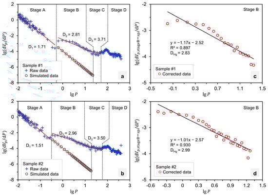 between 3 and 4, there is significant pore compression due to increased mercury pressure [,]. As mercury pressure escalates, observable damage to the pore structure occurs, rendering fractal analysis impracticable, signifying the onset of Stage D [].