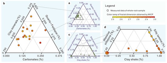 On the other hand, the observed lower fractal dimensions within silty laminae, as contrasted with massive siltstone, might result from the difference in dissolution effect. As illustrated in Figure 13, the fractal dimension reflects the disparity in feldspar and carbonate dissolution macropores across distinct lithologies. The highest values are found in massive siltstone, followed by silty laminae, with the lowest values in clay shale. Such variation may be tied to the different degrees of organic acid dissolution, which differentially promotes the enlargement of dissolution macropores and simplification of pore networks across each lithology. Being the primary source rock, clay shale generates considerable organic acids that trigger pronounced dissolution. As silty laminae are situated closer to the source rock than massive siltstone, they endure more intense organic acid dissolution and thus exhibit lower heterogeneity in dissolution pores. The dissolution effect is thus pivotal in reducing the complexity of macropore structures within the silty laminae when compared to massive siltstone. Furthermore, the significance of the pore-type composition in influencing heterogeneity also warrants careful consideration. Figure 7 and Figure 13 reveal that, in comparison to massive siltstone, silty laminae exhibit a higher proportion of dissolution pores characterized by a relatively low fractal dimension, in addition to a lower percentage of inter-clay mineral pores, which possess a relatively high fractal dimension. This differential pore-type composition likely constitutes an additional pivotal factor that imparts silty laminae with a lower heterogeneity in their macropore system.