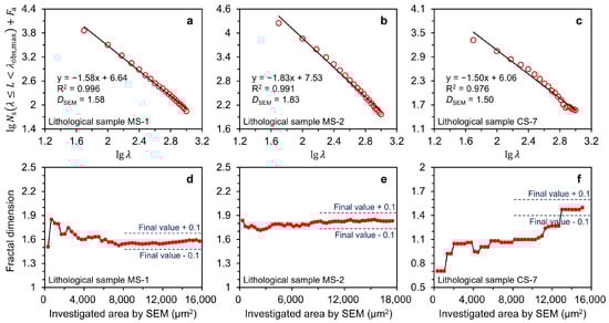 for lithological samples (a) MS-1, (b) MS-2, and (c) SL-11(1), as derived from SEM data. The representativeness of the fractal data was assessed by examining the variations in fractal dimensions with an increasing SEM-investigated area. Lithological samples (d) CS-6 and (e) MS-1 show fractal dimension stability within 0.1 of the final value, confirming their representativeness, while fluctuations in (f) CS-7 exceed this threshold, indicating a failure in the representativeness criteria. Representative validation results for all lithological samples are detailed in Table S3.