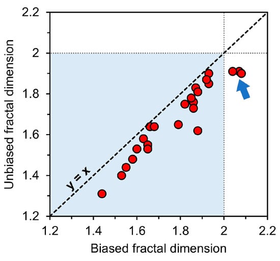 Comparison of biased and unbiased fractal dimensions: biased values exceed unbiased values and sometimes surpass the theoretical maximum of 2 (see points indicated by the arrow). Unbiased fractal dimensions were derived using the improved cumulative-size distribution model, whereas biased fractal dimensions were obtained by applying the traditional cumulative-size distribution model without accounting for the inherent limitations of SEM analysis. This dataset includes only samples that passed the fractal dimension representativeness test.
