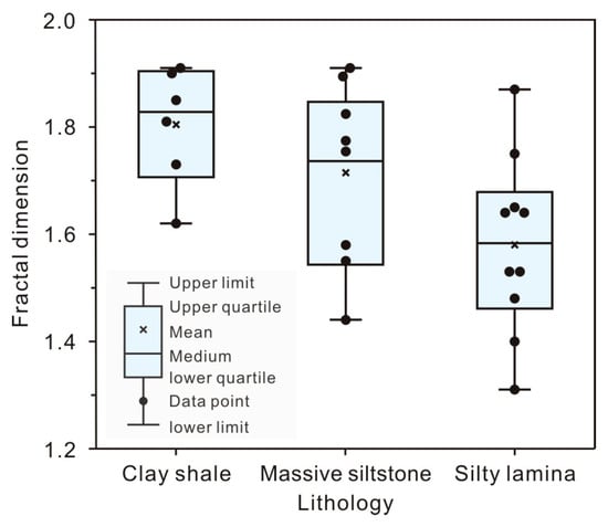Box-plot of the macropore fractal dimension within the clay shale, massive siltstone, and silty lamina of the Chang-7 shale oil reservoirs. The data included are restricted to lithological samples that fulfill the fractal dimension representativeness verification criteria.