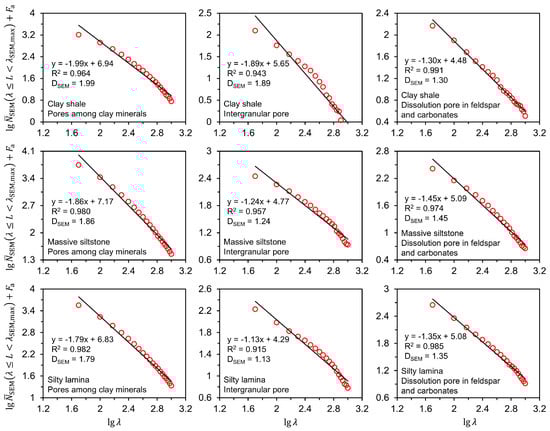 The fractal characteristics of pore structures can also be evaluated using SEM digital analysis. In two-dimensional profiles, the fractal cumulative-size distribution model is given as follows [,]: