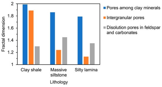 Previous studies have identified distinct fractal characteristics associated with different types of pores in shale reservoirs [,]. Moreover, our research further demonstrates that even the same type of pores can show significant fractal dimension variations across different lithologies. For instance, the intergranular pores within clay shale exhibit a higher fractal dimension than those in massive siltstone or silty laminae (Figure 13). This could be due to a lack of detrital grains in clay shale, which would otherwise provide a rigid framework, resulting in reduced resistance to compaction. As a result, pore sizes are smaller, and pore structures are more complex. These findings are also consistent with the largest fractal dimensions observed for inter-clay mineral pores in clay shale relative to the other lithologies. Consequently, clay shale displays the most complex macropore system, primarily caused by substantial compaction effects.