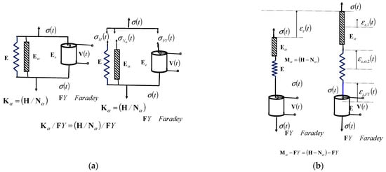 The Maxwell–Faraday fractional-type model with structural formula consist of the Newton viscous fractional-type element, the Hooke ideal elastic element, the Faraday ideally elastic, and the piezoelectric element all connected in series (Figure 1b). This Maxwell–Faraday fractional-type model properties are that the axial dilatation ratio of fractional type thought all the model is equal to sum of the axial dilatation ratio of each element (Newton viscous fractional type element), (Hooke ideal elastic element) and (Faraday ideally elastic and piezoelectric element) in series.