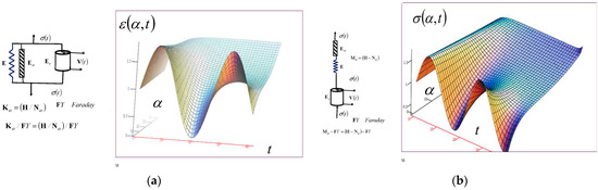 (a) The surface of the delayed elasticity of the Kelvin–Voigt–Faraday fractional-type model, (b) the surface of normal stress relaxation in the Maxwell–Faraday fractional-type model. Both models exhibit a piezoelectric property.