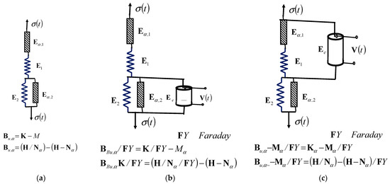 In this section, we describe complex Burgers–Faraday fractional-type models and their dynamical behavior. The schematic of the Burgers fractional-type model (Figure 3a) and Burgers–Faraday fractional-type models are shown in Figure 3b,c. The Burgers–Faraday fractional-type model presented in Figure 3b is obtained by introducing the Faraday element in parallel connection with the Kelvin–Voigt fractional type element of the Burgers fractional-type model. The Burgers–Faraday fractional-type model presented in Figure 3c is obtained by introducing the Faraday element in parallel connection with the Maxwell fractional-type element of the Burgers fractional-type model. The Burgers fractional-type model (Figure 3a) represents a series of connections between a Maxwell fractional-type element and the Kelvin–Voigt fractional-type element.