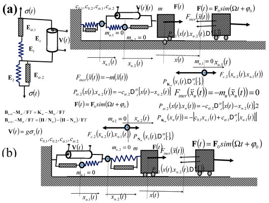 At the points of serial connections of the simple elements and substructure within the structure of the standard light complex rheological Burgers–Faraday–VES model of fractional type, we place a fictitious material point with zero mass, denoted by and to set up a system of fractional-order differential equations. Given that the basic mass (rigid body) of the system is , and the rheological dynamic Burgers–Faraday–BFY VES DS system (Figure 4a, presented in upper part) has three degrees of freedom, the system of fractional-order differential equations takes the following form:
