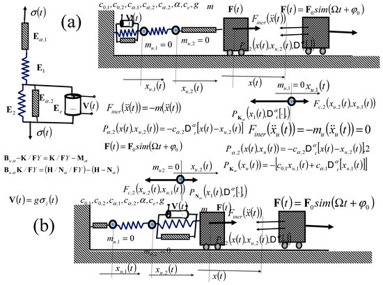 Burgers–Faraday discrete dynamical system of fractional-type BFY VES DS fractional-type oscillator with piezoelectric properties: (a) A rheological discrete dynamic system consisting of a single material point (rigid body) with mass , connected by a standard light complex Burgers–Faraday–VES rheological model of the ideal fractional type (BFY VES DS, upper part in figure). The system has one external and two internal degrees of freedom. (b) A dynamic rheological system with the reversed sequence of the structure’s connections in the standard light complex ideal Burgers–Faraday model of fractional type (BFY VES DSR, lower part in figure).