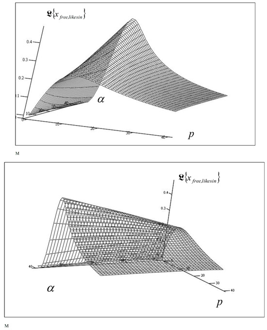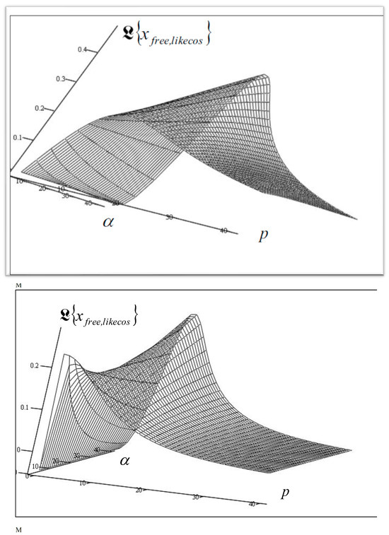 The space surfaces of the Laplace transform , of the free creep (flow) mode, cosine-like type, of the external generalized coordinate of the rheological Burgers–Faraday–VF DS discrete dynamic system of fractional type with piezoelectric property, presented in the Laplace transformation space and in coordinate system with coordinate axes: elongation of Laplace transformation, the differentiation exponent of the fractional order in the interval , and the Laplace transforms parameter , drawn using analytical Expression (122), for different system parameter value.