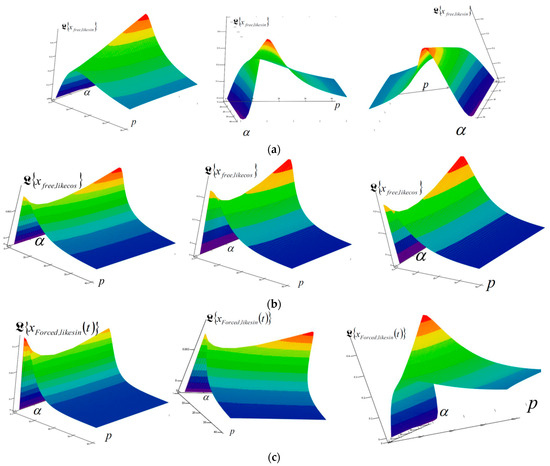 The space surfaces of the Laplace transform , of the forced creep (flow) mode of the external generalized coordinate of the rheological Burgers–Faraday–VF DS discrete dynamic system of fractional type with piezoelectric property, in the cases of single-frequency periodic force action , presented in the Laplace transformation space and in coordinate system with coordinate axes: elongation of Laplace transformation, the differentiation exponent of the fractional order in the interval , and the Laplace transforms parameter , drawn using analytical expression (124), for different system parameter value.