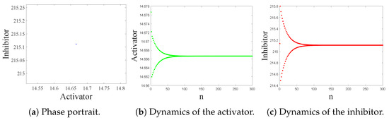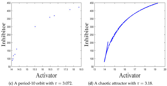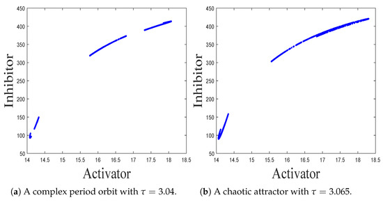 - Wang, J.L.; Li, Y.; Zhong, S.H.; Hou, X.J. Analysis of bifurcation, chaos and pattern formation in a discrete time and space Gierer Meinhardt system. Chaos Solitons Fractals 2019, 118, 1–17. [Google Scholar] [CrossRef]