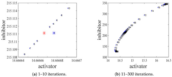 . The activator and inhibitor densities at each site change with time under the guidance of the system dynamics. Between different sites, there are local reactions and spatial diffusions [23,51]. From t to